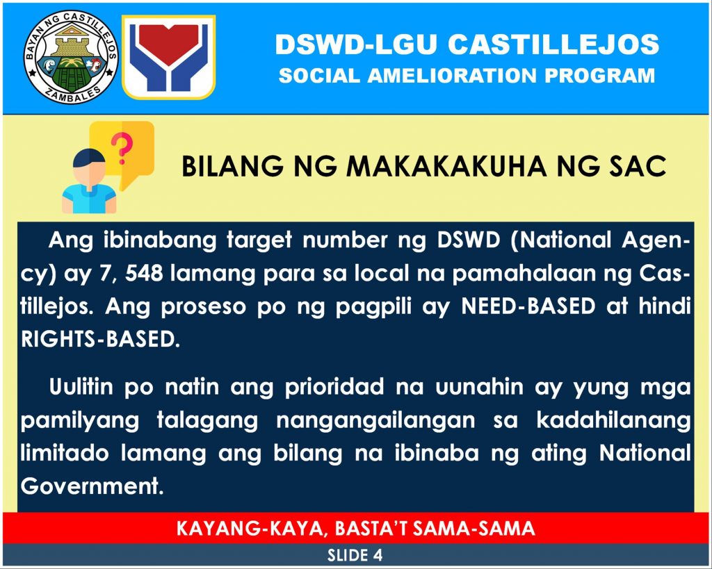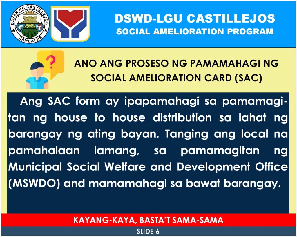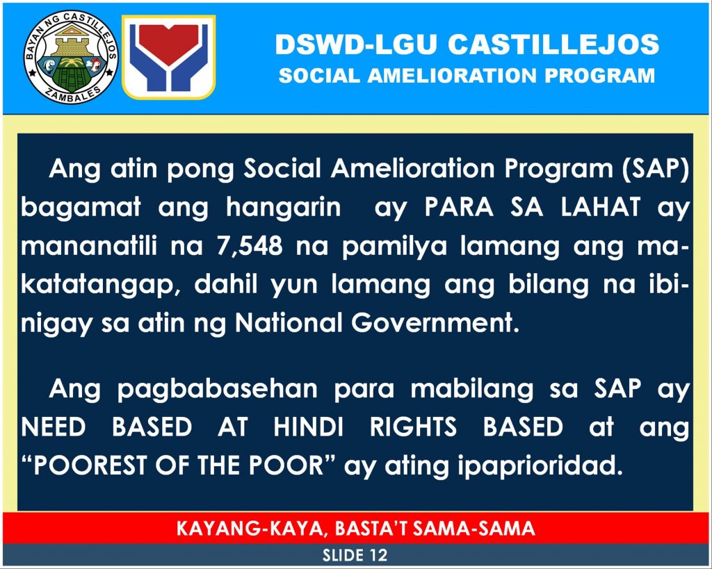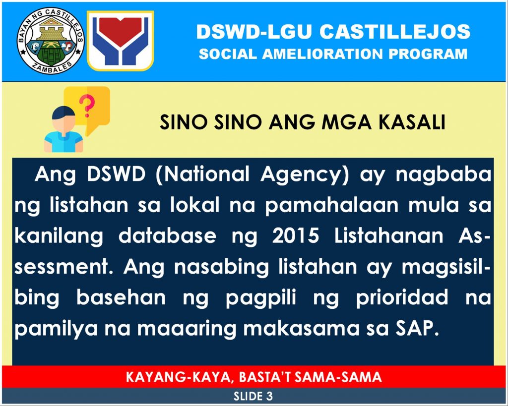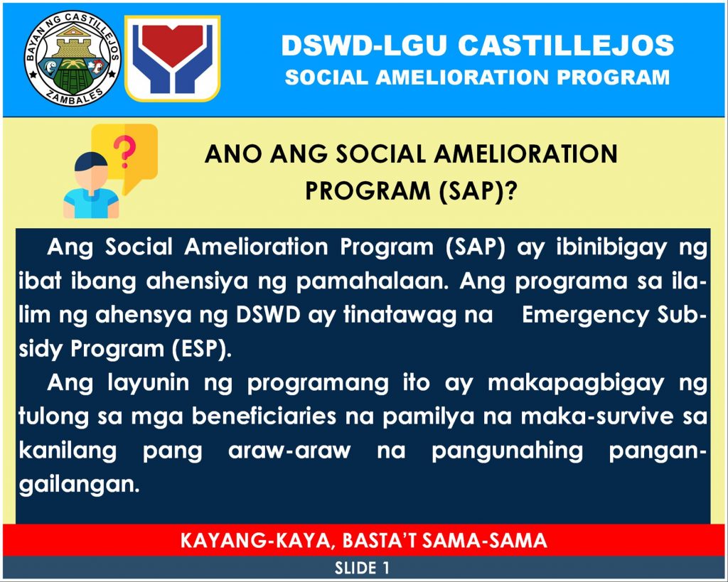 Social Amelioration Program (SAP) Guidelines Post author:Castillejos - MIS Post published:April 23, 2020 Post category:News SAP Guidelines posted by the Municipality of Castillejos You Might Also Like COVID-19 Update (May 6, 2021) May 7, 2021 Castillejos Confirms its 66th and 67th Residents to Test Positive for COVID-19 February 8, 2021