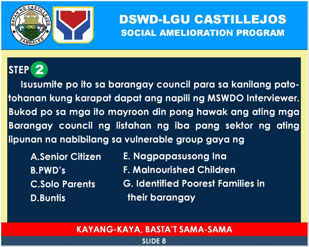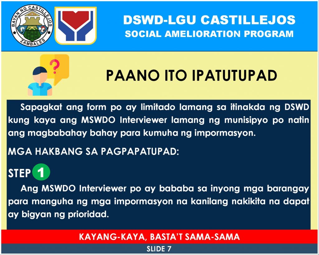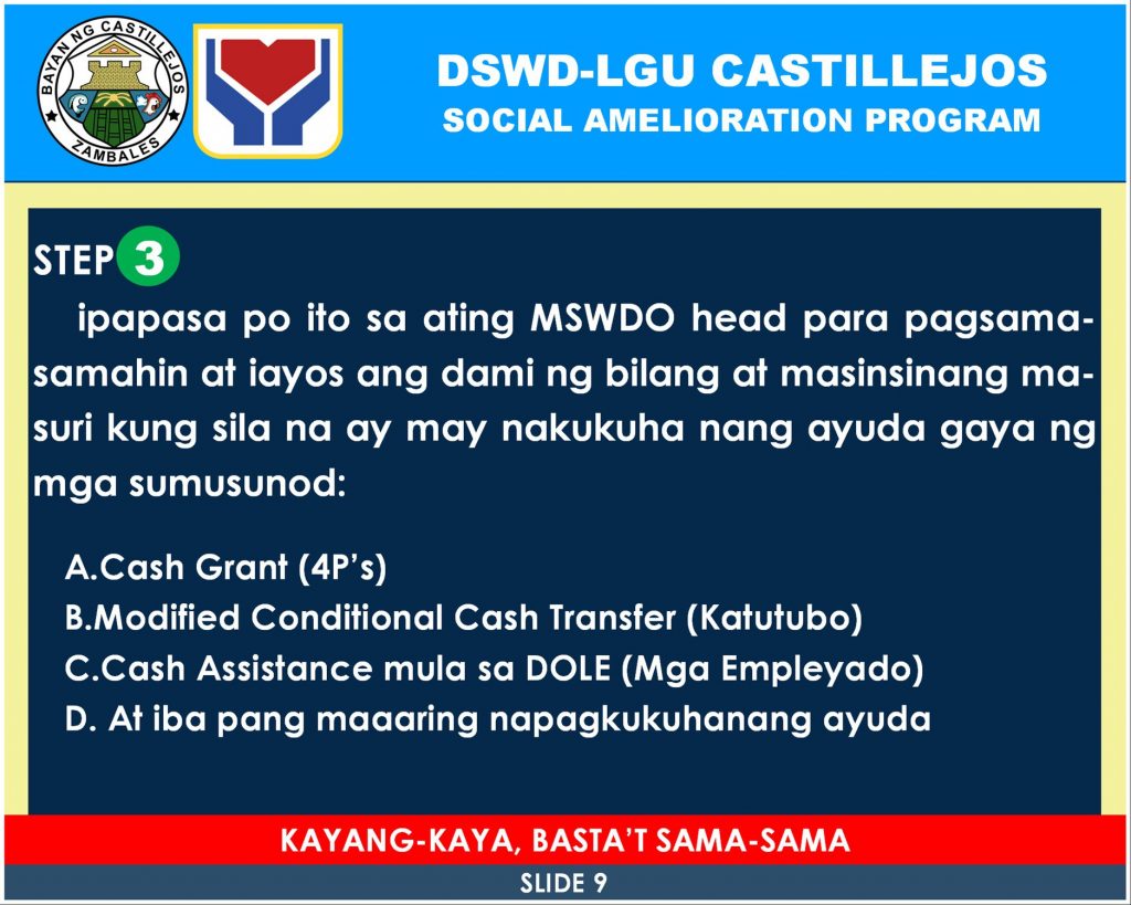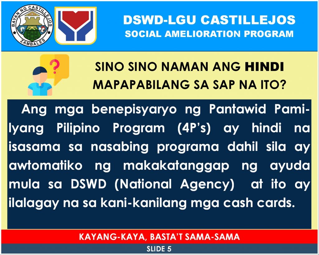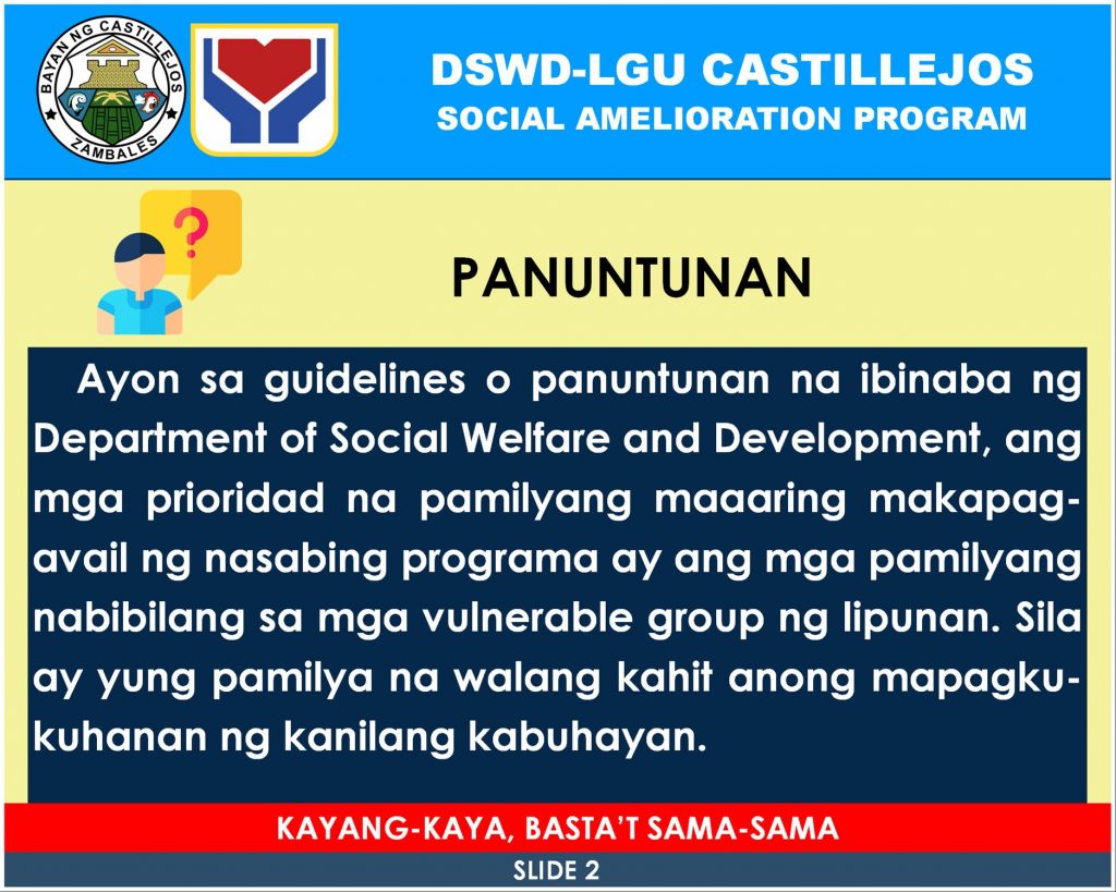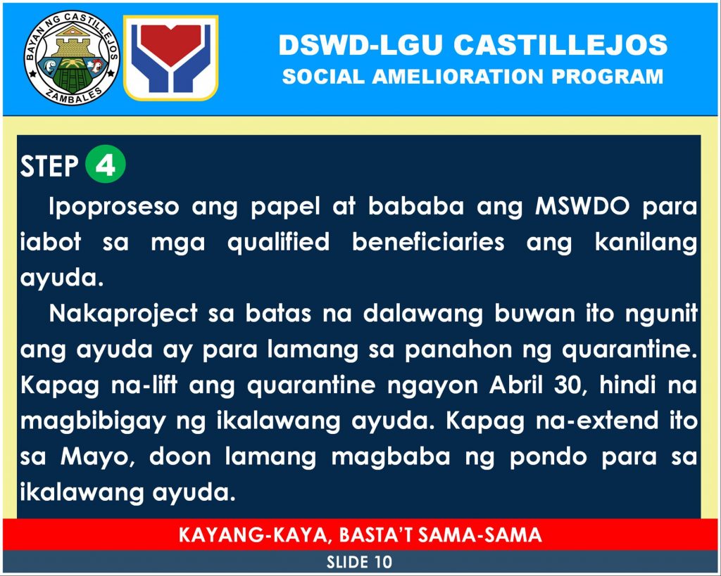 Social Amelioration Program (SAP) Guidelines Post author:Castillejos - MIS Post published:April 23, 2020 Post category:News SAP Guidelines posted by the Municipality of Castillejos You Might Also Like COVID-19 Update (May 6, 2021) May 7, 2021 Castillejos Confirms its 66th and 67th Residents to Test Positive for COVID-19 February 8, 2021